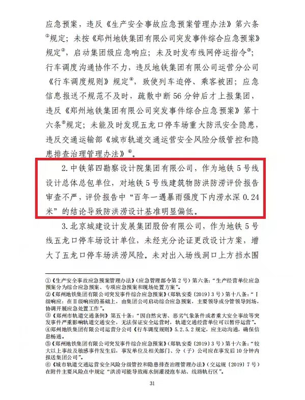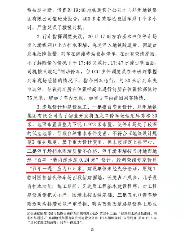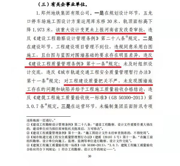 调查认定:这是一起由极端暴雨引发严重城市内涝,涝水冲毁停车场挡水围墙、灌入地铁隧道,造成14人死亡。郑州地铁集团有限公司擅自变更设计,未上报发改委审核,设计单位违规向施工单位提供白图,郑州地铁集团有限公司违规同意采用白图施工,施工单位违规采用白图施工,质监站未发现问题和缺陷,并出具了工程质量验收合格的监督意见。郑州市雨水管道仅2400余公里,196.3亿海绵投资,实际与海绵城市相关的仅占32%,用于景观、绿化等占近56%。