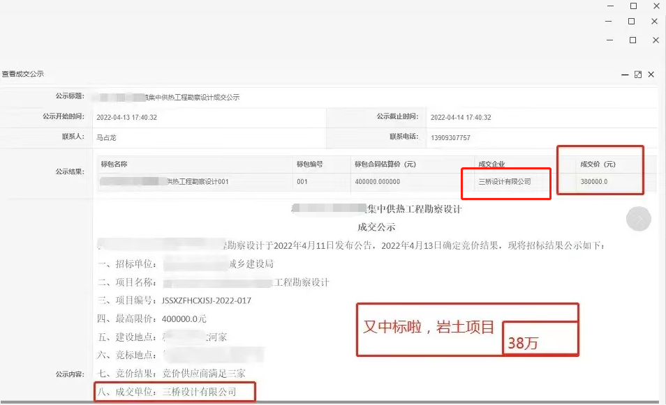 三桥设计院中标岩土工程勘察项目,费用38万