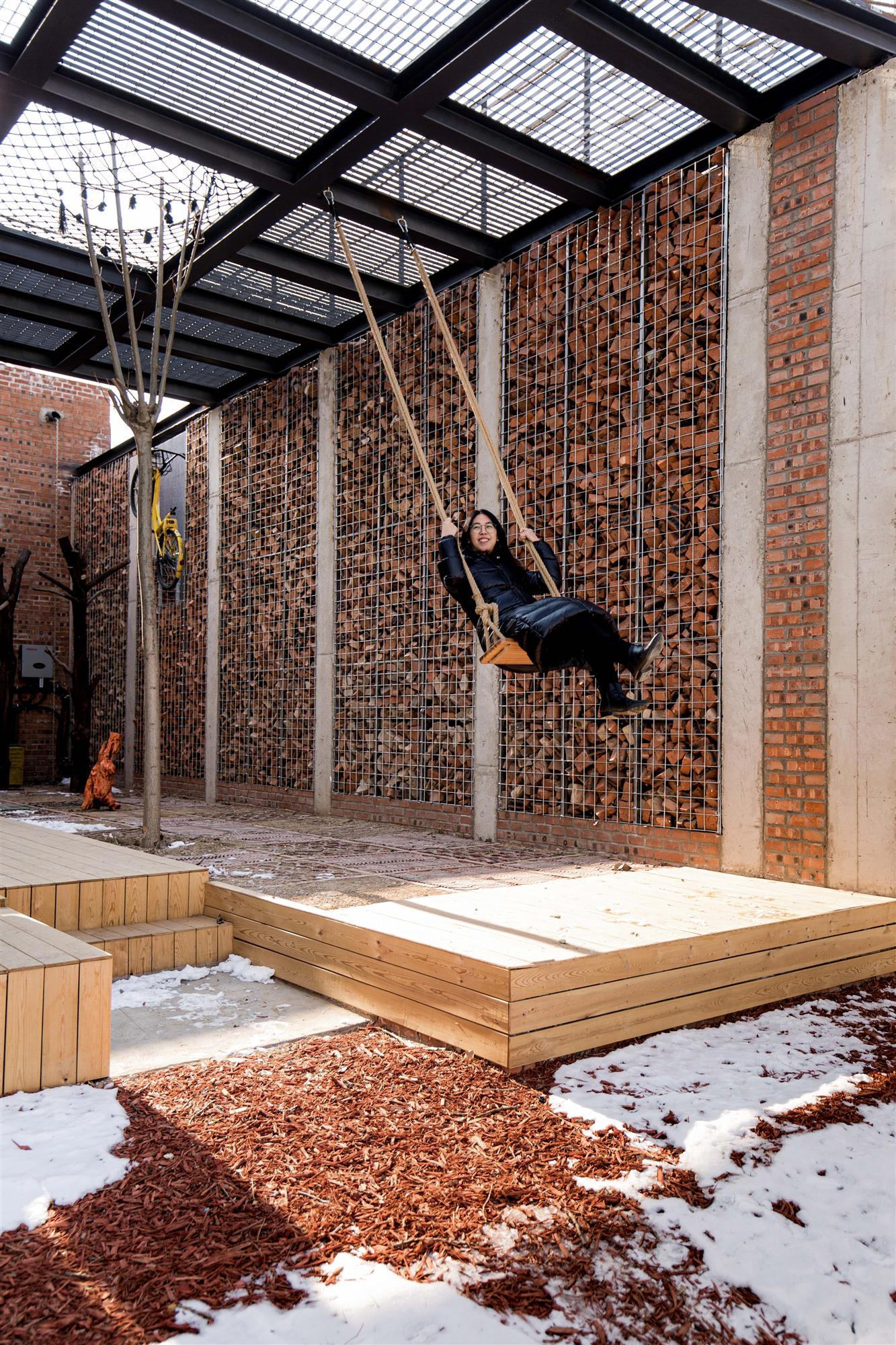 大面积的天窗和风塔为室内采光与通风提供了充足的补给,创造了冬暖夏凉的人居环境,郁郁葱葱的杨树透过天窗向室内洒下斑驳的倒影,建筑与自然自成画卷。