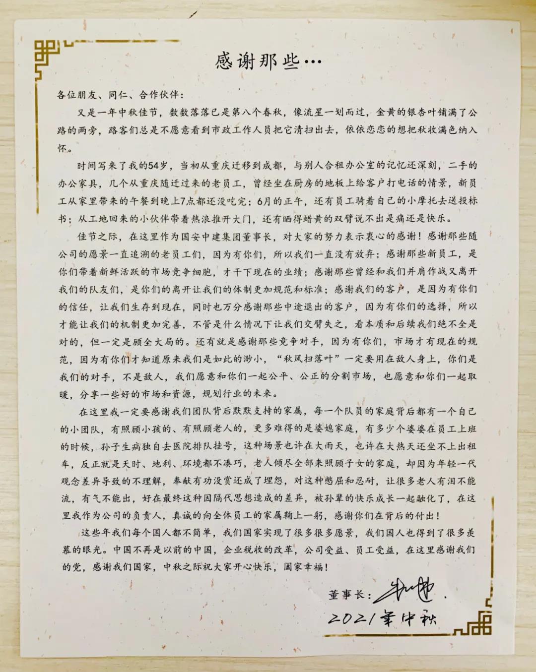 佳节之际,在这里作为国安双都集团董事长,对大家的努力表示衷心的感谢!感谢那些随公司的愿景一直追溯的老员工们,因为有你们,所以我们一直没有放弃;感谢那些新员工,是你们带着新鲜活跃的市场竞争细胞,才干下现在的业绩;感谢那些曾经和我们并肩作战又离开我们的队友们,是你们的离开让我们的体制更加规范和标准;感谢我们的客户,是因为有你们的信任,让我们生存到现在,也希望你们做大做强,也可以学习总公司的经营模式,甚至可以手把手的教,让我们携手共创未来,同时也万分感谢那些中途退出的客户,因为有你们的选择,所以才能让我们的机制更加完善,不管是什么情况下让我们交臂失之,看本质和后续我们绝不全是对的,但一定是顾全大局的。还有就是感谢那些竞争对手,因为有你们,市场才有现在的规范,因为有你们才知道原来我们是如此的渺小,“秋风扫落叶”一定要用在敌人身上,你们是我们的对手,不是敌人,我们愿意和你们一起公平、公正的分割市场,也愿意和你们一起取暖,分享一些好的市场和资源,规划行业的未来。